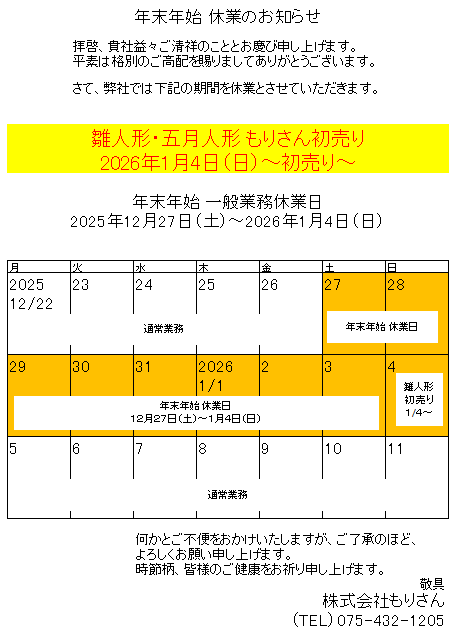 【雛人形・五月人形 もりさん初売りのお知らせ】