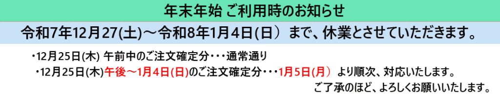 【令和7年12月25日(木)午後~令和8年1月4日(日)】ご注文確定分につきましては、令和8年1月5日(月)~順次、ご対応いたします。